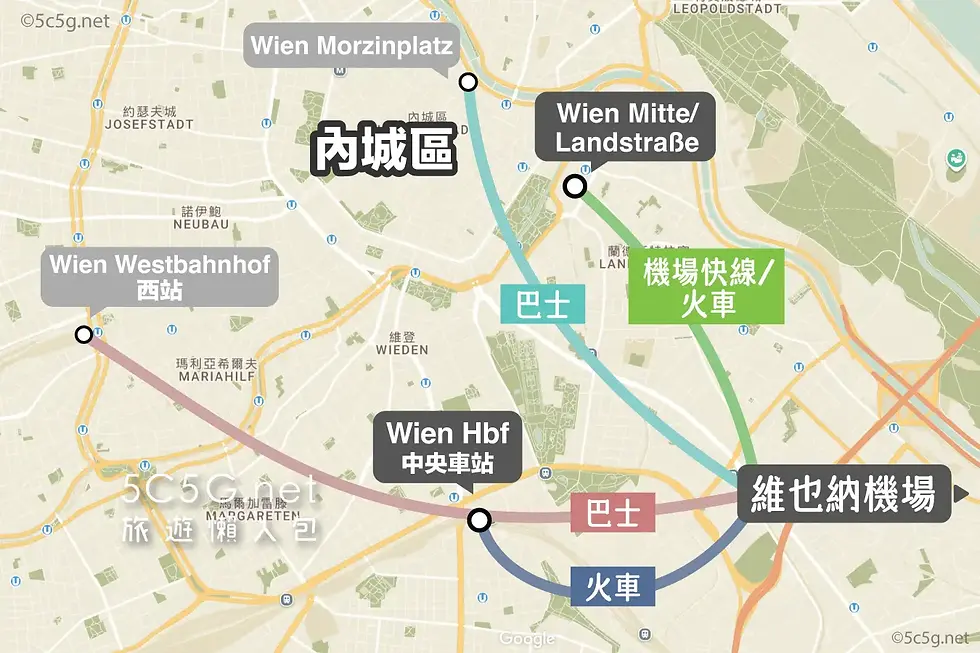由機場到市區的交通工具,主要有兩大目的地。第一是內城區,最靠近市中心商業區;第二是維也納中央車站「Wien Hbf」,從這裡能轉乘火車到其他城市。我們會在下文分成兩個目的地,再簡單說明當中交通選擇。